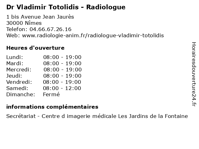 1 Dr Vladimir Pop - Médecin généraliste (Distance: 29,34 km) 7 rue Nicolas-Saboly, 13637 Arles consultation, docteur, dr, généraliste, med, médecin, médecine, pop, traitement, vladimir 3 Dr Tania Stoltz Totolidis - Médecin généraliste (Distance: 52,07 km) 1127 Route du Thor, 84210 Pernes-les-Fontaines docteur, dr, generaliste, généraliste, medical, médecin, soin, stoltz, tania, totolidis 4 Dr Tania Totolidis - Médecin nutritionniste (Distance: 59,21 km) 1111 Avenue Jean Henri Fabre, 84200 Carpentras dr, médecin, nutrionniste, nutrition, nutritionniste, sante, soin, tania, totolidis 5 Dr Stéphanie David - Radiologue (Distance: 0,00 km) 1 bis Avenue Jean Jaurès, 30000 Nîmes consultation, david, docteur, dr, med, médecin, radiologue, stéphanie, traitement 6 Dr Catherine Dupasquier - Radiologue (Distance: 0,00 km) 1 bis Avenue Jean Jaurès, 30000 Nîmes catherine, consultation, docteur, dr, dupasquier, med, médecin, radiologue, traitement |