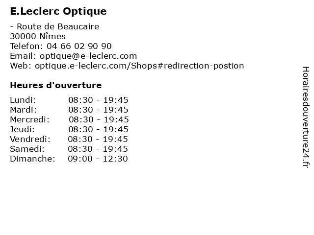 1 Leclerc - Borne de recharge électrique (Distance: 0,02 km) - Rue de l'Abrivado, 30000 Nîmes borne, de, leclerc, recharge, électrique 3 E.Leclerc Station Service (Distance: 0,08 km) route de Beaucaire, 30000 Nimes e.leclerc, fournisseur de gaz, fournisseur de gaz propane, service, station 4 E.Leclerc Stations-Service (Distance: 0,52 km) . Route De Beaucaire, 30000 Nimes e.leclerc, service, services, services à la personne, stations 5 TotalEnergies Access - RELAIS NIMES LECLERC (Distance: 1,79 km) 390 . AVENUE PIERRE MENDES FRANCE, 30000 NIMES access, gas station, leclerc, nimes, relais, station service, tankstelle, total, totalenergies 6 Le Groupe E.Leclerc - Car park (Distance: 2,19 km) - Route de Beaucaire, 30230 Nimes car, car parking, e.leclerc, groupe, le, park, services |