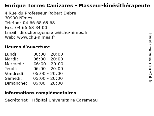 1 Dr Fanelly Torres - Chirurgien viscéral et digestif (Distance: 2,53 km) 480 Avenue Saint Andre De Codols, 30900 Nîmes chirurgien, digestif, docteur, dr, et, fanelly, sante, soins, torres, viscéral 2 Francisco Largo Torres - Psychologue (Distance: 3,08 km) 5 Rue du Fort, 30000 Nîmes folie, francisco, largo, psychiatre, psychiatrie, psychiatrique, psychologue, torres 3 Dr Stéphane Torres - Psychiatre (Distance: 3,17 km) 1 Rue Corconne, 30000 Nîmes dr, folie, psychiatre, psychiatrie, psychiatrique, stephane, stéphane, torres 4 Enrique Dépannage (Distance: 7,32 km) - Chemin de l'Aérodrome, 30900 Nîmes artisan, audio;vidéos, dépannage, dépanneur, enrique, nîmes 5 Pizzeria Rotisserie d Autrefois (Distance: 35,56 km) Port Royal, 30240 Le Grau Du Roi autrefois, enrique, pizzeria, restaurants, rotisserie 6 Ramon Torres Leal - Masseur-kinésithérapeute (Distance: 36,22 km) 1 Avenue des Chasseurs, 34920 Le Crès docteur, kine, kinesitherapeute, kinésithérapeute, leal, masseur, ramon, torres |