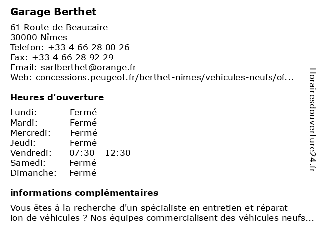 1 Dr Jean-Philippe Berthet - Chirurgien général (Distance: 47,91 km) 371 avenue du Doyen Gaston Giraud, 34000 Montpellier berthet, chirurgien, consultation, docteur, dr, général, jean, med, médecin, philippe, traitement 2 Nimes Negoce Pneus - NexusAuto (Distance: 0,04 km) 52 route de Beaucaire, 30000 Nimes automobile, carrosserie, entretien, garage, negoce, nexusauto, nimes, pneus, réparation, vidange 3 Garage Odéon - Renault (Distance: 0,59 km) 28 Rue Pierre Semard, 30000 Nimes automobile, commercial, concessionnaire, garage, neuf, occasion, odéon, renault, vente 4 Garage du Globe - Citroën (Distance: 0,97 km) 20 boulevard Natoire, 30000 Nimes automobile, citroën, du, entretien, garage, globe, neuf, occasion, réparation, vente, vidange 5 Confort Auto / Garage James (Distance: 1,25 km) 232 Route d'Avignon, 30000 Nimes auto, automobile, automoto, autovision, confort, contrôle technique, garage, james, r&r 6 Garage de la Gare - Euro Repar (Distance: 1,28 km) 17 Rue Sainte-Félicité, 30000 Nîmes automobiles, de, euro, garage, gare, la, location de voiture, location de véhicules, motos, repa, repar |