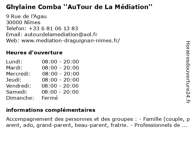 1 Autour du Voyage (Distance: 7,37 km) - lieu-dit Pas de Trêts, 13112 La Destrousse agence, autour, du, hôtel, réservation, séjour, vol, voyage, voyages 3 Association de Médiation et d'Aide aux Victimes - AMAV (Distance: 37,06 km) 110 Rue Aimé Autrand, 84000 Avignon aides, amav, association, aux, d'aide, de, et, médiation, soutiens, victimes 4 Autour d'Un Cafe (Distance: 39,94 km) 27 Avenue Frederic Mistral, 13160 Chateaurenard autour, cafe, restaurants 5 Autour Du Comptoir (Distance: 46,73 km) . Route de Carnon, 34970 Lattes autour, comptoir, du, restaurant, restauration 6 Association de Médiation Familiale Moderato (Distance: 47,19 km) 615 Avenue de Montpellier, 34970 Lattes association, de, familiale, moderato, médiation |