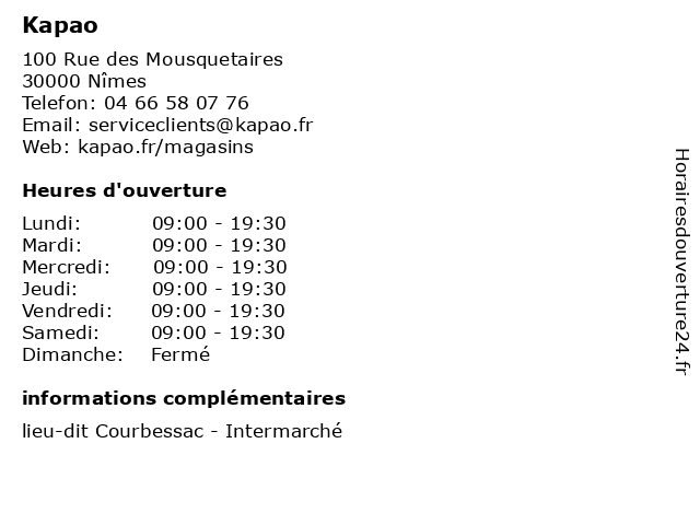 1 Kapao (Distance: 11,78 km) - Centre Commercial Intermarché, 30540 Milhaud cosmétique, kapao, maquillage, parfum 2 Nocibé (Distance: 4,22 km) 22 Boulevard Gambetta, 30051 Nimes beauté, cosmétique, maquillage, nocibé, parfumerie, soins 3 Marionnaud Nîmes Madeleine (Distance: 4,30 km) 11 Rue de la Madeleine, 30000 Nimes accessoires, coiffure, madeleine, maquillage, marionnaud, nîmes, parfum, pharmacie, soins du corps 4 Repetto - MARIE M (Distance: 4,34 km) 7 rue de l'Hotel de Ville, 30000 Nîmes chaussures, garde-robe, marie, maroquinerie, parfum, repetto 5 Repetto - STYL'DANSE (Distance: 4,44 km) 2 rue Auguste, 30000 Nîmes chaussures, garde-robe, maroquinerie, parfum, repetto, styl'danse 6 Marionnaud (Distance: 4,51 km) 1755 Avenue Pierre Mendes France, 30000 Nimes accessoires, coiffure, maquillage, marionnaud, parfum, pharmacie, soins du corps |