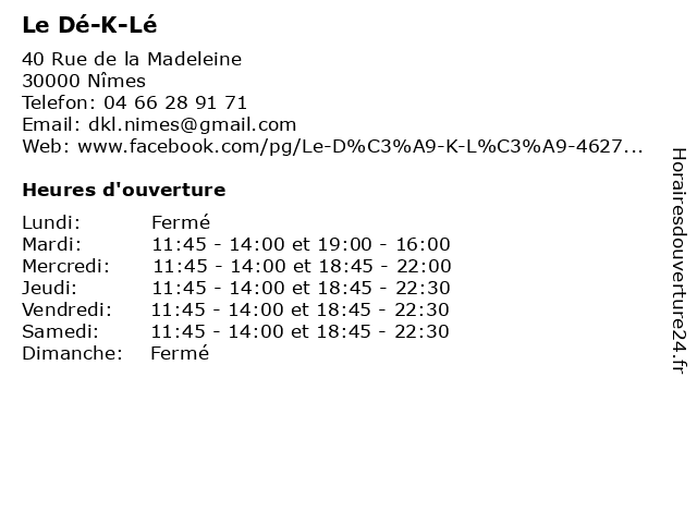 | Mardi | 11:45-14:00 et 19:00-16:00 |