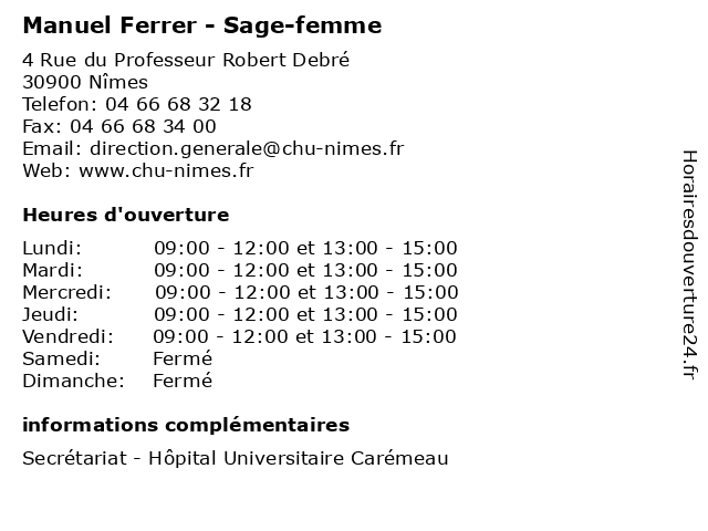1 Dr Jean-Michel Ferrer - Anesthésiste (Distance: 0,00 km) 4 Rue du Professeur Robert Debré, 30900 Nîmes anesthésiste, consultation, docteur, dr, ferrer, jean, med, michel, médecin, traitement 2 Dr Catherine Marsollier-Ferrer - Gynécologue obstétricien (Distance: 0,04 km) - Place du Professeur Robert Debré, 30029 Nimes catherine, chimiothérapie, dr, ferrer, gynécologue, hémopathie, immunothérapie, marsolier, marsollier, obstétricien, oncologie, oncologue, sénologie 3 Garage Manuel Nunes (Distance: 12,97 km) 1066 Chemin du Mas Barbut, 30129 Redessan garage, manuel, nunes, occasion, réparation, vente, voitures 4 Dr Manuel Grau - Médecin généraliste (Distance: 15,77 km) 4 Rue Alexandre Fleming, 30190 Saint-Geniès-de-Malgoirès docteur, dr, generaliste, grau, généraliste, manuel, medical, médecin, soin 5 Ferrer Traiteur (Distance: 18,05 km) 7 Rue des Remparts, 30800 Saint-Gilles bar, bistro, bistrot, brasserie, café, ferrer, pub, restaurant, restauration, resto, traiteur 6 Sébastien Ferrer Psychanalyste (Distance: 18,25 km) 3 Rue Joseph Delteil, 30190 Sauzet ferrer, psychanalyste, sébastien |