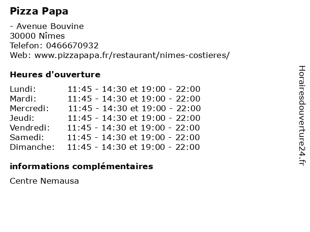 1 Pizza Papa (Distance: 2,19 km) 8 Boulevard Amiral Courbet, 30000 Nîmes boissons, menus, papa, pizza, pizzeria, restaurants 2 La Piazza Papa (Distance: 0,00 km) . Avenue Bouvine, 30000 Nîmes italien, la, papa, piazza, pizzas, pâtes, restaurant, salades, spécialités 3 Pizza Verona (Distance: 1,05 km) 24 Rue de Vérone, 30000 Nîmes brasserie, café, pizza, repas, restaurant, verona 4 Bon A' Pizza (Distance: 1,20 km) - Boulevard Sergent Triaire, 30000 Nimes a', bon, cuisine, pizza, pizzas, pizzeria, restaurant, restaurants 6 Au Comptoir à Pizza (Distance: 2,33 km) 26 Rue de la Curaterie, 30000 Nimes au, comptoir, cuisine, pizza, pizzas, pizzeria, restaurant, restaurants |