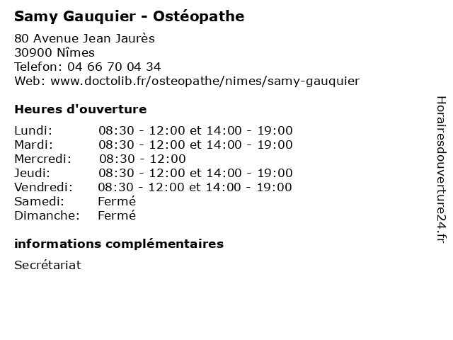 1 Dr Samy El Ouadie - Médecin généraliste (Distance: 0,97 km) 9 Rue Racine, 30900 Nîmes docteur, dr, el, generaliste, généraliste, medicald, médecin, ouadie, samy, soin 2 Olivier Allemand - Ostéopathe (Distance: 0,00 km) 80 Avenue Jean Jaurès, 30900 Nîmes actes et symptômes, allemand, expertises, médecin, olivier, ostéopathe, posturologie 3 Carole Gounelle - Ostéopathe (Distance: 0,38 km) 15 Rue de la Casernette, 30900 Nîmes actes et symptômes, carole, expertises, gounelle, médecin, ostéopathe, ostéopathie pédiatrique 4 Jérome Julien - Ostéopathe (Distance: 0,49 km) 28 rue la Bienfaisance, 30900 Nîmes cabinet, julien, jérome, ostéopathe, ostéopathie 5 Catherine Volpe - Ostéopathe (Distance: 0,58 km) 21 Avenue Georges Pompidou, 30900 Nîmes actes et symptômes, catherine, expertises, médecin, ostéopathe, ostéopathie pédiatrique, volpe 6 |
