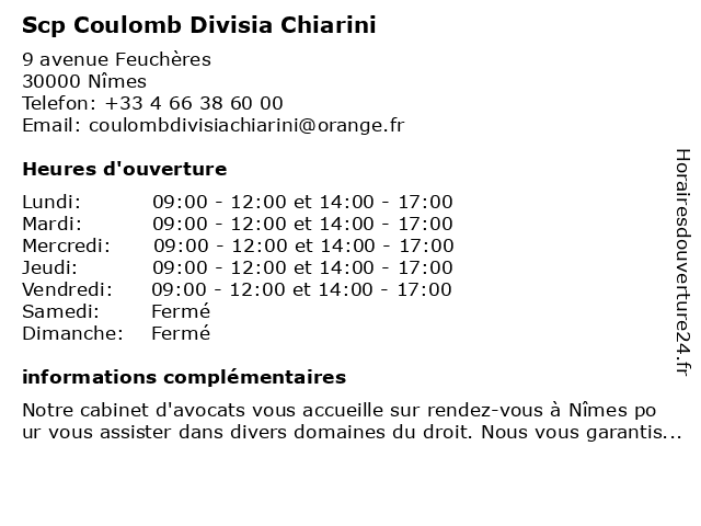 2 SCP Peleriaux - Gisclard - Badaroux - Huissiers de justice associés (Distance: 0,38 km) 1 rue saint Marc, 30000 Nîmes associés, badaroux, constat, de, gisclard, huissier, huissiers, justice, peleriaux, recouvrement, scp, sommation, étude 3 SCP Fontaine Floutier Avocats (Distance: 0,55 km) 3 Place Gabriel Péri, 30000 Nîmes avocat, avocats, floutier, fontaine, law firm, lawyer, marseille, maître, riahi, scp 4 SCP Chevalier, Chalvet & Casula - Office notarial (Distance: 0,89 km) 6 rue Auguste, 30021 Nimes assoc, biens, casula, chalvet, chevalier, notaire, notaires, notarial, office, scp 5 Gerbet Frédéric Huguet Catherine De Le Hoye Xavier SCP-Notaires Associés (Distance: 1,28 km) 116 Allée Norbert Wiener, 30000 Nîmes associés, catherine, de, frédéric, gerbet, hoye, huguet, le, notaires, scp, xavier 6 |