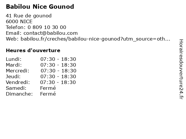 1 Crèche Babilou Nice Gounod (Distance: 0,02 km) 41 rue Gounod, 06000 Nice accueil, babilou, crèche, crèches, de, enfants, garde, garderie, gounod, halte-garderie, micro-crèche, mode, multi-accueil, nice, parents 3 Meli Melodie Babilou (Distance: 0,13 km) 24 Rue Gounod, 06000 Nice babilou, caregivers houses, child care, family home, home care, kindergartens, meli, melodie, micro-nurseries, parental home 5 Babilou (Distance: 0,58 km) 25 Rue Meyerbeer, 06000 Nice babilou, babysitting, crèches, garde d'enfants 6 Babilou (Distance: 0,72 km) 59 Rue de la Buffa, 06000 Nice babilou, babysitting, crèches, garde d'enfants |