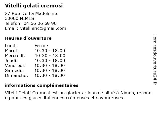 Vitelli Gelati Cremosi est un glacier artisanale situé à Nîmes, reconnu pour ses glaces italiennes crémeuses et savoureuses.