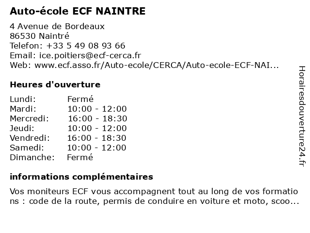 1 ECF - Ecole de Conduite Française (Distance: 0,05 km) 4, Avenue de Bordeaux, 86530 Naintré auto / moto, conduite, de, ecf, ecole, entraînement, française, services 2 Auto-école ECF CHATELLERAULT (Distance: 6,95 km) 10 Avenue du Président Wilson, 86100 Châtellerault auto, chatellerault, ecf, école 3 ECF - Ecole de Conduite Française (Distance: 6,99 km) 10, Avenue du Président Wilson, 86100 Chatellerault auto / moto, conduite, de, ecf, ecole, entraînement, française, services 4 Centre de Formation Professionnelle ECF SAINT GEORGES LES BAILLARGEAUX (Distance: 10,89 km) Lieu-dit Les Moinards, 86130 Saint-Georges-lès-Baillargeaux baillargeaux, centre, de, ecf, formation, georges, les, professionnelle, saint 5 ECF - Ecole de Conduite Française (Distance: 10,95 km) - ZA Les Moinards, 86130 Saint Georges les Baillargeaux auto / moto, conduite, de, ecf, ecole, entraînement, française, services 6 Auto-école ECF SAINT GEORGES LES BAILLARGEAUX (Distance: 10,96 km) Rue de l'Artisanat, 86130 Saint-Georges-lès-Baillargeaux auto, baillargeaux, ecf, georges, les, saint, école  |
