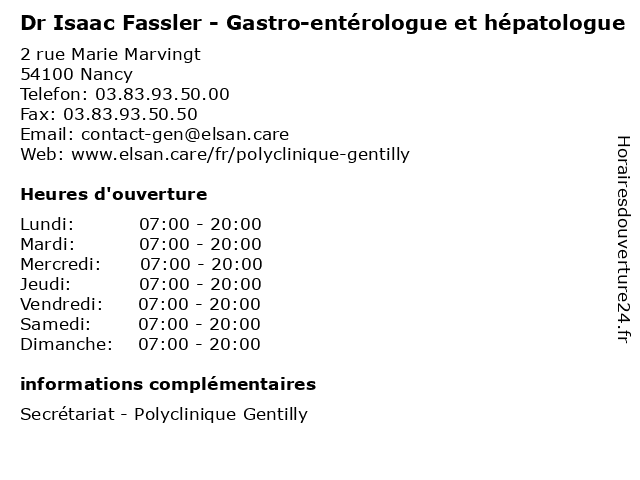 1 Dr Isaac Fassler - Gastro-entérologue et hépatologue (Distance: 6,58 km) 42 Rue du 8 Mai 1945, 54270 Essey-lès-Nancy dr, enterelogue, entérologue, et, fassler, gastro, hepatolgue, hépatologue, isaac, soins 2 Dr Robert Abensur - Gastro-entérologue et hépatologue (Distance: 0,00 km) 2 rue Marie Marvingt, 54100 Nancy abensur, consultation, docteur, dr, entérologue, et, gastro, hépatologue, med, médecin, médecine, robert, traitement 3 Medecin Jean François Chambre (hépatologue) (Distance: 0,41 km) 37 Julie Daubie, 54000 Nancy chambre, docteur, françois, hépatologue, jean, medecin, sante, services 4 Medecin Frederic Magnin (hépatologue) (Distance: 3,63 km) 127 Rue Saint-Dizier, 54000 Nancy docteur, frederic, hépatologue, magnin, medecin, sante, services 5 Medecin Paul Dieterling (hépatologue) (Distance: 3,63 km) 127 Rue Saint-Dizier, 54000 Nancy dieterling, docteur, hépatologue, medecin, paul, sante, services 6 Medecin Paul Dieterling - Horaires du Cabinet (hépatologue) (Distance: 3,63 km) 127 Rue Saint-Dizier, 54000 Nancy cabinet, dieterling, docteur, du, horaires, hépatologue, medecin, paul, sante, services |