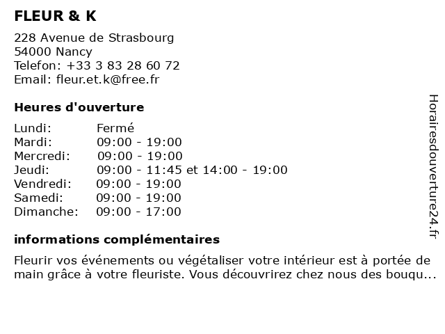2 3 Fleur Morlet - Sage-femme (Distance: 1,94 km) 54 Avenue du XX Corps, 54000 Nancy du, femme, fleur, maternité, morlet, périnée, rééducation, sage, uro-gynécologique 4 Crèches Multi-Accueil Fleur de Sel (Distance: 12,15 km) 5 rue Jean Joseph Chamant, 54110 Haraucourt accueil, animations jeunesse, crèches, de, fleur, multi, relais assitantes maternelles, sel 5 Marché de Xaronval (Distance: 31,97 km) . Village, 88130 Xaronval alimentaire, de, fleur, habillement, marché, services, xaronval 6 Marché de Charmes (Distance: 34,86 km) . Place de l'Espée, 88130 Charmes alimentaire, charmes, de, fleur, habillement, marché, services |