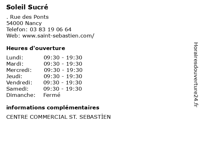 2 Café du Soleil (Distance: 4,53 km) 56 Rue de Castelnau, 57000 Metz bar, boissons, brasserie, café, du, pub, soleil 3 Le Palais du Soleil (Distance: 4,72 km) 23 Rue du Pont des Morts, 57000 Metz bar, bistro, bistrot, brasserie, café, du, le, palais, restaurant, restauration, soleil 5 Le Soleil d'Or (Distance: 5,05 km) 1 Place Saint Jean, 57685 Augny augny, cuisine, d'or, le, or, restaurant, soleil 6 Centre Soleil (Distance: 5,07 km) 50 Rue Serpenoise, 57000 Metz cabine de bronzage, centre, liftmodelage, lipomodelage, soleil |