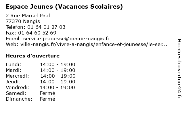 1 Espace Jeunes (Périodes Scolaires) (Distance: 0,00 km) 2 Rue Marcel Paul, 77370 Nangis activités, espace, jeunes, loisirs, période, périodes, scolaire, scolaires 2 Point Information Jeunesse (Périodes Scolaires) (Distance: 0,00 km) 2 Rue Marcel Paul, 77370 Nangis activités, association, centre, information, jeunesse, nangis, point, périodes, scolaires, social 3 Point Information Jeunesse (Vacances Scolaires) (Distance: 0,04 km) 2 Rue Marcel Paul, 77370 Nangis administration, assoc, information, jeunesse, point, scolaires, services, services publics, vacances 5 Espace Autos 77 (Distance: 16,13 km) 27 rue de Merlange, 77130 Saint-Germain Laval 77, automobile, autos, entretien, espace, garage, montage, pneus, réparation, vidange 6 L'Espace Sellerie (Distance: 16,78 km) 1 Ter Rue de la Loge aux Bergers, Zone Artisanale, 77820 Le Châtelet-en-Brie automobile, châtelet-en-brie, cuir, espace, l'espace, sellerie |