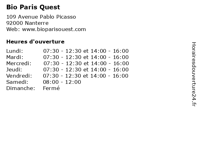 1 Bio Paris Quest (Distance: 2,03 km) 54 Rue de Bezons, 92400 Courbevoie bio, biologique, laborataire, paris, quest, santé, services 2 Bio Paris Quest (Distance: 2,11 km) 20 Avenue du Général de Gaulle, 92150 Suresnes bio, biologique, laborataire, paris, quest, santé, services 3 Bio Paris Quest (Distance: 2,47 km) 94-96 Boulevard de la République, 92250 La Garenne-Colombes bio, biologique, laborataire, paris, quest, santé, services 4 Bio Paris Quest (Distance: 2,50 km) 1 Place Hérold, 92400 Courbevoie bio, biologique, laborataire, paris, quest, santé, services 5 Bio Paris Quest (Distance: 2,97 km) 456 Rue Gabriel Péri, 92700 Colombes bio, biologique, laborataire, paris, quest, santé, services 6 Bio Paris Quest (Distance: 4,17 km) 6 Rue Barbès, 92300 Levallois-Perret bio, biologique, laborataire, paris, quest, santé, services |