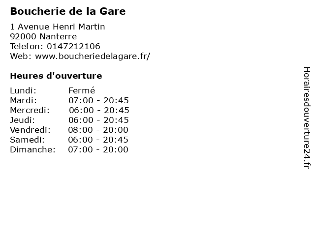1 Boucherie de la Gare (Distance: 5,97 km) 60 Rue Des Bourguignons, 92600 Asnières-sur-Seine boucherie, boucheries, christophe, de, eric, gare, la, madeline, poissonneries, stephane 2 Boucherie De La Gare (Distance: 11,98 km) 25 Rue Auguste Delaune, 93200 Saint-Denis boucherie, boucheries, de, gare, la, poissonneries 3 Yespark, location de parking au mois - Gare RER Nanterre-Ville - avenue Benoit Frachon - Nanterre (Distance: 0,07 km) 2 Avenue Benoît Frachon, 92000 Nanterre au, avenue, benoit, de, frachon, gare, location, mois, nanterre, parking, rer, ville, yespark 4 Boucherie Dialy (Distance: 0,10 km) 8 Boulevard De La Seine, 92000 Nanterre boucherie, boucheries, charcuterie, dialy, viandes 5 Pharmacie de la Gare (Distance: 0,14 km) 82 Bis Rue Maurice Thorez, 92000 Nanterre conseil, de, gare, la, médicaments, pharmacie, santé, soin 6 Yespark, location de parking au mois - Gare/Préfecture - Nanterre (Distance: 1,80 km) 11 Rue Edmond Dubuis, 92000 Nanterre au, de, gare/préfecture, location, mois, nanterre, parking, yespark |