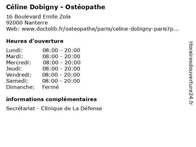 1 Céline Dobigny - Ostéopathe (Distance: 13,37 km) 27 Rue Levert, 75020 Paris actes et symptômes, céline, dobigny, expertises, ostéopathe, ostéopathie de la femme enceinte, ostéopathie pédiatrique 2 Céline Dobigny - Ostéopathe (Distance: 15,65 km) 67 Boulevard Soult, 75012 Paris consultation, céline, dobigny, docteur, med, médecin, médecine, ostéopathe, traitement 3 Dr Céline Bismuth - Médecin généraliste (Distance: 1,17 km) 18 Rue Maurice Thorez, 92000 Nanterre bismuth, céline, de, dr, généraliste, généraux, médecin, soins, tout, type 4 Dr Céline Briend-Pagès - Médecin généraliste (Distance: 1,58 km) 2 Rue du Bois, 92000 Nanterre briend, céline, dr, généraliste, médecin, médecine, médical, pagès, pharmaceutique, traitement 5 Céline Coletta - Ostéopathe (Distance: 2,65 km) 3 Rue des Deux Gares, 92500 Rueil-Malmaison celine, coletta, céline, ostéo, ostéopathe, ostéopathes, soins 6 Maître Céline Wester - Avocate (Distance: 2,86 km) 23 Rue de la Cerisaie, 92150 Suresnes avocate, avocats, civils, céline, droits, juridiques, maître, wester |