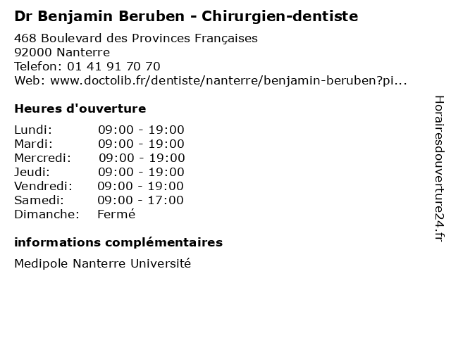 1 Dr Benjamin Beruben - Chirurgien-dentiste (Distance: 17,39 km) 55 Rue Gaston Lauriau, 93100 Montreuil benjamin, beruben, chirurgien, dent, dentiste, docteur, dr, soins 2 Benjamin Fourniquet - Masseur-kinésithérapeute (Distance: 0,04 km) 468 Boulevard des Provinces Françaises, 92000 Nanterre benjamin, docteur, fourniquet, kinésithérapeute, masseur, médecin, médecine, secrétariat 3 Dr Benjamin Zakine - Chirurgien-dentiste (Distance: 0,71 km) 84 Esplanade Charles de Gaulle, 92000 Nanterre benjamin, chirurgien, consultation, dentiste, docteur, dr, med, médecin, traitement, zakine 4 Maître Benjamin Desmurs - Avocat (Distance: 1,63 km) 130 Rue du 8 Mai 1945, 92000 Nanterre avocat, avocats, benjamin, civils, desmurs, droits, juridiques, maître 5 Benjamin Khellaf - Ostéopathe (Distance: 5,99 km) 3 Rue Ferdinand Buisson, 92110 Clichy benjamin, khellaf, osteo, osteopathe, ostéopathe, sante, soins 6 Dr. Vitasse Benjamin - Ostéopathe (Distance: 6,21 km) . Rue Yvon VillarceauI, 75016 Paris benjamin, docteur, dr., medecins, ostéopathe, sante, vitasse |