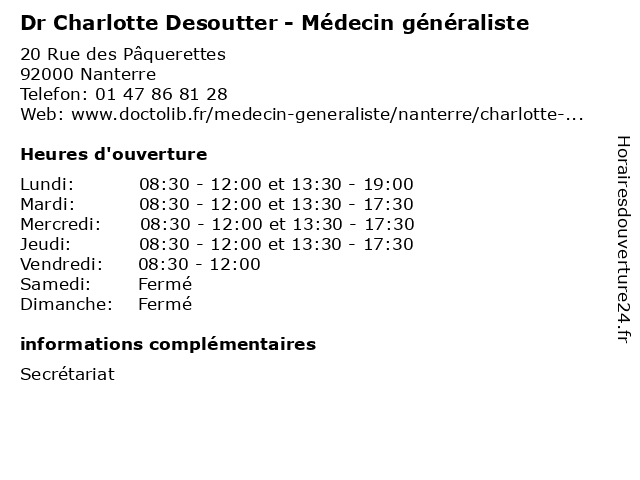 | Lundi | 08:30-12:00 et 13:30-19:00 |