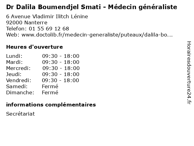1 Dr Dalila Boumendjel Smati - Médecin généraliste (Distance: 0,50 km) 18 Rue Maurice Thorez, 92000 Nanterre boumendjel, dalila, docteur, dr, généraliste, médecin, smati 2 Dr Dalila Boumendjel Smati - Médecin généraliste (Distance: 2,54 km) 20 Rue des Pâquerettes, 92000 Nanterre boumendjel, dalila, dr, généraliste, généraux, médecin, smati, soins 3 Dr Dalila Boumendjel-Smati - Médecin généraliste (Distance: 1,59 km) 79 Avenue Pablo Picasso, 92000 Nanterre boumendjel, cms, dalila, docteur, dr, generaliste, généraliste, medical, médecin, nanterre, smati, soin 4 Dr. Smati - Gynecologie (Distance: 3,00 km) 26-30 Rue Anatole France, 92800 Puteaux docteur, dr., gynecologie, medecins, sante, smati 5 Dr Dalila Boumendjel-Smati - Gynécologue médical - secretariat (Distance: 3,00 km) 26 Rue Anatole France,, 92800 Puteaux boumendjel, dalila, dr, gynécologue, médecin, médecine, médical, pharmaceutique, secretariat, smati, traitement 6 |