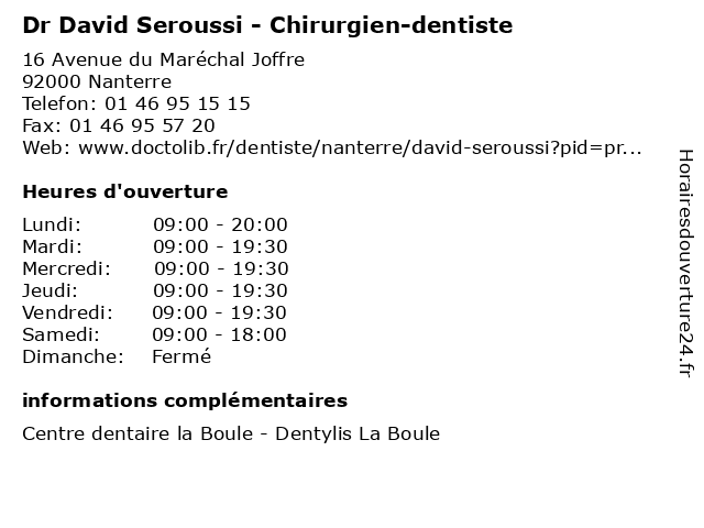 2 Jean-Louis David (Distance: 0,46 km) 1 Rue du Marché, 92000 Nanterre coiffeur, david, jean, louis, mixte 3 Jean-Louis David (Distance: 2,74 km) 25 Avenue Edouard Vaillant, 92150 Suresnes coiffeur, david, jean, louis, mixte 4 Jean Louis David (Distance: 2,94 km) 15 Parvis de la Défense, 92092 Paris La Défense chaussures, david, jean, lingerie, louis, mode enfant, mode femmes, mode hemmes, sport 5 Jean-Louis David (Distance: 3,49 km) 21 Rue Paul Lafargue, 92800 Puteaux coiffeur, david, jean, louis, mixte 6 Dr David Seroussi - Chirurgien-dentiste - secrétariat (Distance: 3,81 km) 147 Boulevard Charles de Gaulle, 92700 Colombes chirurgien, consultation, david, dentiste, docteur, dr, med, médecin, médecine, secrétariat, seroussi, traitement |