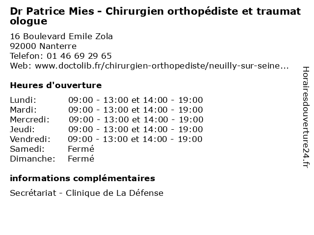 1 Basic-Fit - Esplanade Patrice Chéreau (Distance: 0,65 km) 176 Esplanade Patrice Chéreau, 92000 Nanterre basic, chéreau, cours, esplanade, fit, musculation, patrice, running, salles, santé, sport 2 Dr Agnès Raould - Chirurgien orthopédiste (Distance: 0,84 km) 468 Boulevard des Provinces Françaises, 92000 Nanterre agnes, agnès, chirurgien, consultation, docteur, dr, med, médecin, médecine, orthopédiste, raould, secrétariat, traitement 3 Dr Erwan Pansard - Chirurgien orthopédiste (Distance: 2,73 km) 40 Rue Worth, 92150 Suresnes chirurgien, chirurgien orthopédiste, dr, erwan, médecins, médicaments, orthopédiste, pansard, santé, secrétariat, spécialiste 4 Dr Benoit Villain - Chirurgien orthopédiste (Distance: 2,73 km) 40 Rue Worth, 92150 Suresnes benoit, chirurgien, chirurgien orthopédiste, dr, médecins, médicaments, orthopédiste, santé, secrétariat, spécialiste, villain 5 Dr Grégoire Rougereau - Chirurgien orthopédiste et traumatologue (Distance: 2,98 km) 40 rue worth, 92150 Suresnes cheville, chirurgie, chirurgien, dr, et, foch, genou, grégoire, hôpital, orthopédiste, pied, rougereau, traumatologue 6 Dr Lionel Benamran - Chirurgien orthopédiste et traumatologue (Distance: 3,09 km) 97 Avenue Albert 1er, 92500 Rueil-Malmaison benamran, chirurgien, clinique, de, docteur, dr, et, générale, les, lionel, martinets, nucleaire, orthopédiste, privée, radioactives, ramsay, sante, santé, traumatologue |