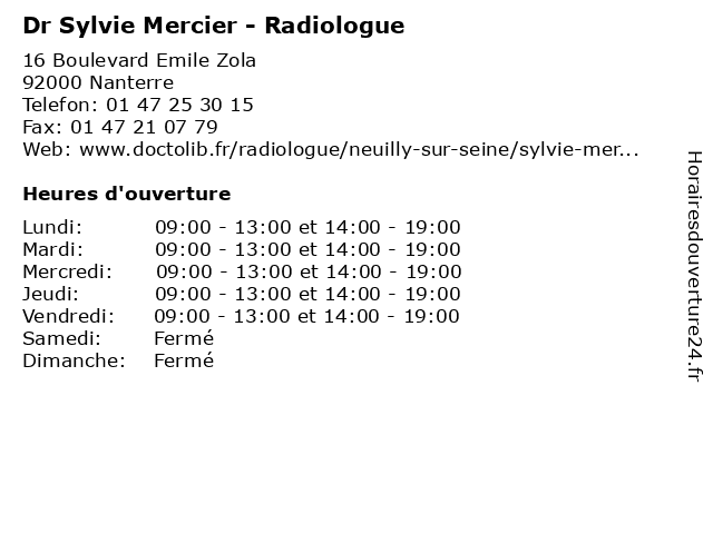 1 Dr Sylvie Mercier - Radiologue (Distance: 0,00 km) 16 Boulevard Emile Zola, 92000 Nanterre consultation, docteur, dr, med, mercier, médecin, médecine, radiologue, secrétariat, sylvie, traitement 2 Dr Sylvie Mercier - Radiologue (Distance: 0,09 km) 16 Boulevard Emile Zola, 92000 Nanterre dr, mercier, médecins, médicaments, radiologue, santé, secrétariat, spécialiste, sylvie 3 Dr Sylvie Mercier - Radiologue (Distance: 3,12 km) 39 Rue de Bezons, 92400 Courbevoie dr, mercier, médecin, médecine, médical, pharmaceutique, radiologue, secretariat, sylvie, traitement 4 Dr Sylvie Mercier - Radiologue (Distance: 3,84 km) 36 Boulevard du Général Leclerc, 92200 Neuilly-sur-Seine dr, mercier, médecins, médicaments, radiologue, santé, secrétariat, spécialiste, sylvie 5 Dr Sylvie Mercier - Radiologue (Distance: 4,71 km) 105 Avenue Charles de Gaulle, 92200 Neuilly-sur-Seine consultation, docteur, dr, med, mercier, médecin, médecine, radiologue, secrétariat, sylvie, traitement 6 Dr Sylvie Mercier - Radiologue (Distance: 4,99 km) 4 Rue Kléber, 92300 Levallois-Perret dr, mercier, médecins, médicaments, radiologue, santé, secrétariat, spécialiste, sylvie |