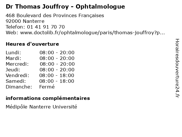 1 Dr Thomas Jouffroy - Ophtalmologue (Distance: 10,09 km) 2 Rue Ambroise Pare, 75010 Paris consultation, docteur, dr, jouffroy, med, médecin, ophtalmologue, thomas, traitement 2 Dr Thomas Jouffroy - Ophtalmologue (Distance: 10,85 km) 25 Rue du Renard, 75004 Paris consultation, docteur, dr, jouffroy, med, médecin, médecine, ophtalmologue, thomas, traitement 3 Dr Nicolas Pogorzalek - Ophtalmologue - secrétariat (Distance: 0,00 km) 468 Boulevard des Provinces Françaises, 92000 Nanterre consultation, docteur, dr, med, médecin, médecine, nicolas, ophtalmologue, pogorzalek, secrétariat, traitement 4 Dr Fabien Hayate - Ophtalmologue (Distance: 0,00 km) 468 Boulevard des Provinces Françaises, 92000 Nanterre consultation, docteur, dr, fabien, hayate, med, médecin, médecine, ophtalmologue, secrétariat, traitement 5 Dr Thomas Jactat - Médecin généraliste (Distance: 0,00 km) 468 Boulevard des Provinces Françaises, 92000 Nanterre consultation, docteur, dr, généraliste, jactat, med, médecin, médecine, secrétariat, thomas, traitement 6 Dr Talal Beytoun - Ophtalmologue - secrétariat (Distance: 1,70 km) 147 Boulevard Charles de Gaulle, 92700 Colombes beytoun, consultation, docteur, dr, med, médecin, médecine, ophtalmologue, secrétariat, talal, traitement |