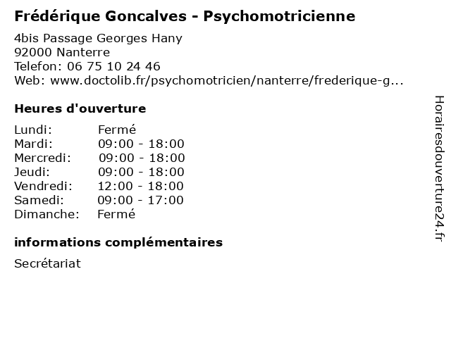 1 Maître Frédérique Lepoutre - Avocate (Distance: 0,77 km) 121 Avenue Paul Doumer, 92500 Rueil-Malmaison avocate, avocats, civils, droits, frédérique, juridiques, lepoutre, maître 2 Dr Frédérique Vasseur - Médecin généraliste (Distance: 1,75 km) 3 Rue des 2 Gares, 92500 Rueil-Malmaison docteur, dr, frederique, frédérique, generaliste, généraliste, medical, médecin, soin, vasseur 3 Emma Garcia Lopez, Psychomotricienne D.E. (Distance: 1,86 km) 9 Rue Auguste Perret, 92500 Rueil-Malmaison d.e., emma, garcia, lopez, psychomotricienne, thérapie physique 4 Cabinet de psychomotricité - Emma Garcia Lopez, psychomotricienne D.E. (Distance: 1,86 km) 9 Auguste Perret, 92500 Rueil-Malmaison bougival, cabinet, carrières, chatou, croissy, d.e., de, emma, garcia, houilles, lopez, nanterre, psy, psychomotricien, psychomotricienne, psychomotricité, puteaux, rueil, suresnes, vésinet 5 Dr Frédérique Gotlib - Médecin du travail (Distance: 3,15 km) 55 rue Rouget de Lisle, 92150 Suresnes consultation, docteur, dr, du, frederique, frédérique, gotlib, med, médecin, traitement, travail 6 Solenn Le Guen - Psychomotricienne (Distance: 3,18 km) 8 Cours des Bougainvillées, 92500 Rueil-Malmaison guen, le, medecin, psycho, psychomotricienne, sante, solenn |