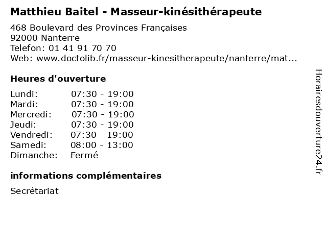 1 Matthieu & Pauline (Distance: 2,06 km) 1 Rue Jean Carasso, 95870 Bezons boulangeries, détail, matthieu, pauline 2 Dr Matthieu Glorion - Chirurgien thoracique et cardio-vasculaire (Distance: 3,32 km) 40 Rue Worth, 92150 Suresnes cardio, chirurgien, dr, et, glorion, matthieu, médecins, médicaments, santé, secrétariat, spécialiste, thoracique, vasculaire 3 Dr Matthieu Groh - Spécialiste en médecine interne (Distance: 3,32 km) 40 Rue Worth, 92150 Suresnes dr, en, groh, interne, matthieu, médecine, médecins, médicaments, santé, secrétariat, spécialiste 4 Dr Matthieu Ponsoye - Spécialiste en médecine interne (Distance: 3,32 km) 40 Rue Worth, 92150 Suresnes dr, en, interne, matthieu, médecine, médecins, médicaments, ponsoye, santé, secrétariat, spécialiste 5 Galerie Matthieu Dubuc (Distance: 3,70 km) 166 Avenue Paul Doumer, 92500 Rueil-Malmaison art, artists, dubuc, galerie, gallery, matthieu 6 Saints Matthieu Et Ava Barsoum Sarl (Distance: 4,31 km) 34 r Du Docteur Marc Bombiger, 92150 Suresnes ava, barsoum, matthieu, restaurants, saints |