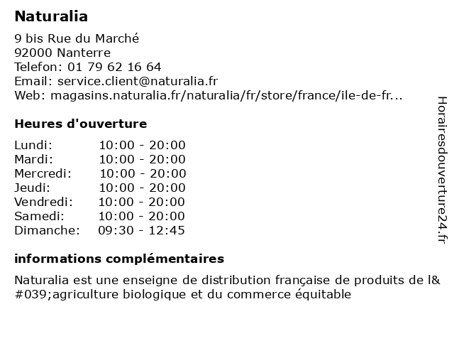 1 Naturalia (Distance: 1,59 km) 17 rue de Maurepas, 92500 Rueil-Malmaison bio, boissons, epicerie, fruits, légumes, naturalia, produits 2 Naturalia (Distance: 3,01 km) 38 Place Maurice Berteaux, 78400 Chatou bio, boissons, epicerie, fruits, légumes, naturalia, produits 3 Naturalia (Distance: 3,03 km) 36 Avenue Fouilleuse, 92500 Rueil-Malmaison bio, boissons, epicerie, fruits, légumes, naturalia, produits 4 Naturalia (Distance: 3,11 km) 80-82 Rue de Verdun, 92800 Puteaux bio, boissons, epicerie, fruits, légumes, naturalia, produits 5 Naturalia (Distance: 3,12 km) 2 Place de la Défense, 92053 Puteaux alimentaire, alimentation, bio, biologique, magasin, naturalia, produits, supermarché, épicerie 6 Naturalia (Distance: 3,23 km) 36 Rue Eugène Eichenberger, 92800 Puteaux bio, boissons, epicerie, fruits, légumes, naturalia, produits |