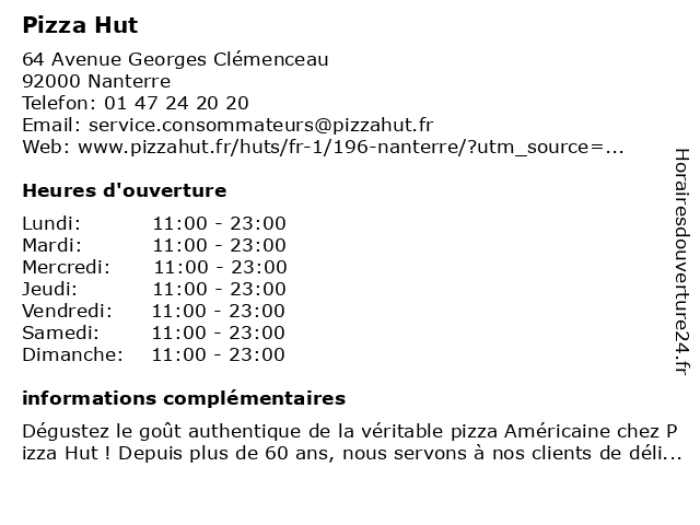 4 Pizza Hut (Distance: 4,36 km) 108 Boulevard Henri Barbusse, 78800 Houilles hut, pizza, pizzeria, restaurant 5 Pizza Hut (Distance: 5,42 km) 33 Avenue Charles De Gaulle, 92200 Neuilly-sur-Seine hut, pizza, restaurants 6 Pizza Hut (Distance: 6,11 km) 77 b Rue Des Bourguignons, 92270 Bois Colombes business, hut, pizza, restaurants |