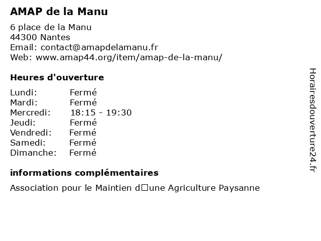 1 Le Bistrot De La Manu (Distance: 0,08 km) 15 Rue De Coulmiers, 44000 Nantes apéritifs, bistrot, boissons, de, la, le, manu, restaurants 2 Multi accueil petite enfance Manu (Distance: 0,14 km) 1 Cours Jules Durand, 44000 Nantes accueil, caregivers houses, child care, enfance, family home, home care, kindergartens, manu, micro-nurseries, multi, parental home, petite 3 AMAP Doulon Toutes-Aides (Distance: 1,40 km) 19 rue Corentin-Bourveau, 44300 Nantes aides, alimentation, amap, doulon, fruits, légumes, primeurs, producteur, toutes, viandes 4 AMAP de l'île (Distance: 1,90 km) 2 rue Conan Mériadec, 44000 Nantes alimentation, amap, de, fruits, l'île, légumes, primeurs, producteur, viandes 5 AMAP Port Boyer (Distance: 2,20 km) 4 rue de la Turballe, 44300 Nantes alimentation, amap, boyer, fruits, légumes, port, primeurs, producteur, viandes 6 AMAP des Sorinières (Distance: 4,02 km) 11 rue du Prinquiau, 44100 Nantes alimentation, amap, des, fruits, légumes, primeurs, producteur, sorinières, viandes |