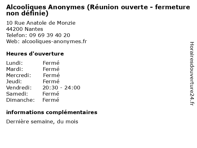 Termes de recherche pour Alcooliques Anonymes (Réunion ouverte - fermeture non définie):reunion, non, fermeture, ouverte, alcooliques, anonymes, définie |