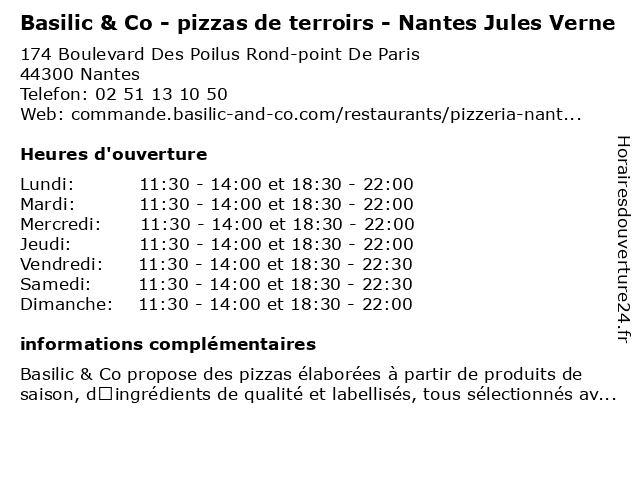 1 Basilic & Co - pizzas de terroirs - Nantes Château (Distance: 2,30 km) 16 Rue De Strasbourg, 44000 Nantes basilic, château, co, de, fast-food, nantes, pizzas, terroirs 2 Basilic & Co - pizzas de terroirs - Nantes Schuman (Distance: 2,31 km) 1 Boulevard Robert Schuman, 44300 Nantes basilic, co, de, fast-food, nantes, pizzas, schuman, terroirs 3 Basilic & Co - pizzas de terroirs - Nantes Saint-Joseph (Distance: 4,27 km) 8 Rue Barbara, 44300 Nantes basilic, co, de, fast-food, joseph, nantes, pizzas, saint, terroirs 4 Le Comptoir à Pizzas (Distance: 0,06 km) 149 Boulevard des Belges, 44300 Nantes bio, comptoir, le, pizzas, pizzeria, restaurant 5 Basket and co (Distance: 2,00 km) 2 rue Évêché, 44000 Nantes accessoires de sport, and, articles, basket, co, vêtements 6 Stéph'Co (Distance: 2,42 km) 4 Rue De Jemmapes, 44000 Nantes cheveux, coiffure, coupe, salons, stéph'co |
