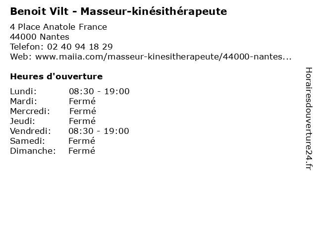 1 Benoit Gibon - Ostéopathe (Distance: 1,35 km) 18 Quai de Versailles, 44000 Nantes benoit, docteur, gibon, médecin, médecine, ostéopathe, secrétariat 2 Dr Benoit Bouteloup - Médecin du travail (Distance: 1,50 km) 2 rue Linné, 44100 Nantes benoit, bouteloup, consultation, docteur, dr, du, med, médecin, traitement, travail 3 Maître Benoit Michel - Avocat (Distance: 1,52 km) 28 Boulevard de Launay, 44100 Nantes avocat, avocats, benoit, civils, droits, juridiques, maître, michel 5 Le Beherec Benoit (Distance: 1,76 km) 48 Rue Hector Berlioz, 44300 Nantes beherec, benoit, restaurants 6 Benoit Erieau - Ostéopathe (Distance: 1,81 km) 47 Rue Maréchal Joffre, 44000 Nantes benoit, erieau, ostéo, ostéopathe, ostéopathes, soins |