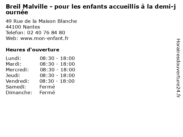1 Breil Malville - pour les enfants accueillis en journée continue (Distance: 0,00 km) 49 Rue de la Maison Blanche, 44100 Nantes accueillis, breil, caregivers houses, child care, continue, en, enfants, family home, home care, journée, kindergartens, les, malville, micro-nurseries, parental home, pour 2 Centre médico-social Breil-Malville - Médecin salarié conseil général Loire Atlantique (secrétariat ) (Distance: 0,19 km) 5 Rue Jules Noël, 44100 Nantes atlantique, breil, centre, conseil, consultation, docteur, général, loire, malville, médecin, médico, salarié, santé, secrétariat, social 3 Bibliothèque du Breil-Malville (Ete:15 juillet au 31 août) (Distance: 0,40 km) 37 Rue des Plantes, 44000 Nantes 15, 31, août, au, bibliothèque, breil, du, ete, juillet, libraire, livre, malville, médiathèque, services 4 Bibliothèque du Breil-Malville (Distance: 0,40 km) 37 Rue des Plantes, 44000 Nantes bibliothèque, breil, du, libraire, livre, malville, médiathèque, services 6 Espace départemental des solidarités Nantes centre -Site Breil (Distance: 2,40 km) 95 Boulevard Eugène Orieux, 44000 Nantes breil, centre, des, départemental, espace, nantes, site, solidarités |
