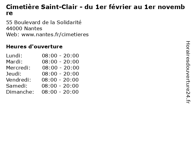 1 Cimetière Saint-Clair - du 2 novembre au 31 janvier (Distance: 0,00 km) 55 Boulevard de la Solidarité, 44000 Nantes 31, arbre, au, cimetiere, cimetière, clair, du, espace vert, forêt, funeraire, janvier, jardin, loisirs, nature, novembre, parc, prairie, saint, square 2 Cimetière Sainte-Anne Nouveau - du 1er février au 1er novembre (Distance: 1,25 km) 88 Rue Amiral Duchaffault, 44100 Nantes 1er, anne, arbre, au, cimetiere, cimetière, du, espace vert, forêt, funeraire, février, jardin, loisirs, nature, nouveau, novembre, parc, prairie, sainte, square 3 Cimetière Sainte-Anne Ancien - du 1er février au 1er novembre (Distance: 1,41 km) 91 Rue Amiral Duchaffault, 44100 Nantes 1er, ancien, anne, arbre, au, cimetiere, cimetière, du, espace vert, forêt, funeraire, février, jardin, loisirs, nature, novembre, parc, prairie, sainte, square 4 Cimetière Saint-Martin Nouveau - du 1er février au 1er novembre (Distance: 1,49 km) 59 Rue des Pavillons, 44100 Nantes 1er, arbre, au, cimetiere, cimetière, du, espace vert, forêt, funeraire, février, jardin, loisirs, martin, nature, nouveau, novembre, parc, prairie, saint, square 5 Cimetière Miséricorde - du 1er février au 1er novembre (Distance: 1,67 km) 4 Rue de la Pelleterie, 44000 Nantes 1er, arbre, au, cimetiere, cimetière, du, espace vert, forêt, funeraire, février, jardin, loisirs, miséricorde, nature, novembre, parc, prairie, square 6 Cimetière Saint-Martin Ancien - du 1er février au 1er novembre (Distance: 1,85 km) - Rue des Réformes, 44000 Nantes 1er, ancien, arbre, au, cimetiere, cimetière, du, espace vert, forêt, funeraire, février, jardin, loisirs, martin, nature, novembre, parc, prairie, saint, square |