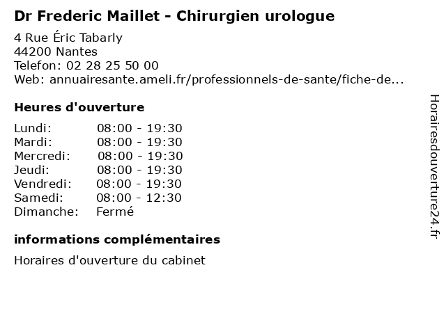 1 Dr Frederic Maillet - Chirurgien urologue (Distance: 0,00 km) 2-4 rue Eric Tabarly, 44000 Nantes chirurgien, consultation, docteur, dr, frederic, maillet, med, médecin, traitement, urologue 2 Dr Olivier Wetzel - Chirurgien urologue (Distance: 5,98 km) - Avenue Claude Bernard, 44800 Saint-Herblain chirurgien, consultation, docteur, dr, med, médecin, médecine, olivier, traitement, urologue, wetzel 3 Dr Philippe Chauveau - Chirurgien urologue (Distance: 6,27 km) 2-4 route de Paris, 44300 Nantes chauveau, chirurgien, consultation, docteur, dr, med, médecin, médecine, philippe, traitement, urologue 4 Dr Philippe Colls - Chirurgien urologue (Distance: 6,27 km) 2-4 route de Paris, 44300 Nantes chirurgien, colls, consultation, docteur, dr, med, médecin, médecine, philippe, traitement, urologue 5 Dr Georges Le Coguic - Chirurgien urologue (Distance: 7,31 km) 4 Avenue Jacques Cartier, 44800 Saint-Herblain chirurgie, chirurgien, coguic, dr, general, georges, le, soins, urologue 6 Dr Pierre Nevoux - Chirurgien urologue - secrétariat (Distance: 7,46 km) - Avenue Jacques Cartier, 44800 Saint-Herblain chirurgien, consultation, docteur, dr, med, médecin, médecine, nevoux, pierre, secrétariat, traitement, urologue |