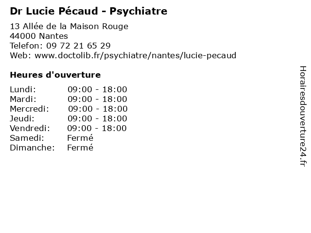 1 Dr Lucile Bellet - Psychiatre (Distance: 0,00 km) 13 Allée de la Maison Rouge, 44000 Nantes bellet, dr, lucile, médecin, médecine, médical, pharmaceutique, psychiatre, secretariat, traitement 2 Dr Julie Bailly - Psychiatre (Distance: 0,00 km) 13 Allée de la Maison Rouge, 44000 Nantes bailly, dr, folie, julie, psychiatre, psychiatrie, psychiatrique 3 Dr Charlotte Charoy - Psychiatre (Distance: 0,00 km) 13 Allée de la Maison Rouge, 44000 Nantes charlotte, charoy, dr, folie, psychiatre, psychiatrie, psychiatrique 4 Dr Elodie Abiad-Cocquelin - Psychiatre de l'enfant et de l'adolescent (Distance: 0,00 km) 13 Allée de la Maison Rouge, 44000 Nantes abiad, cocquelin, de, dr, elodie, et, l'adolescent, l'enfant, psy, psychiatre, sante, soins 5 Dr Samuel Bulteau - Psychiatre (Distance: 0,25 km) 1 Place Alexis Ricordeau, 44093 Nantes bulteau, consultation, docteur, dr, med, médecin, psychiatre, samuel, traitement 6 Dr Marie Guitteny - Psychiatre (Distance: 0,25 km) 1 Place Alexis Ricordeau, 44093 Nantes consultation, docteur, dr, guitteny, marie, med, médecin, psychiatre, traitement |