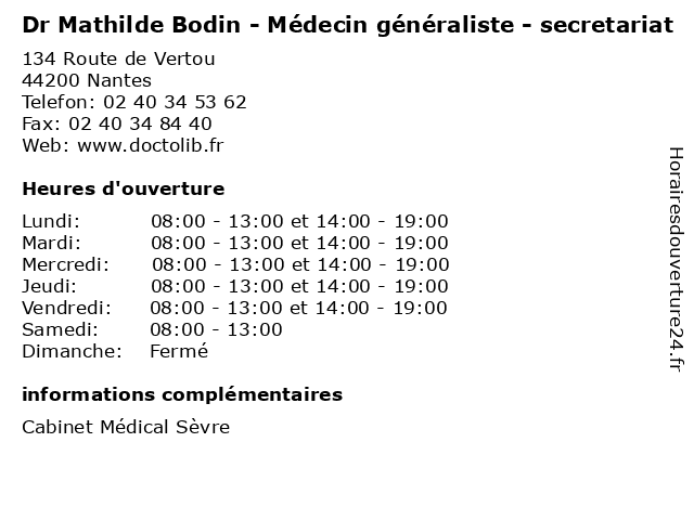 1 Dr Guillaume Simon - Médecin généraliste - secretariat (Distance: 0,00 km) 134 Route de Vertou, 44200 Nantes dr, guillaume, généraliste, médecin, médecine, médical, pharmaceutique, secretariat, simon, traitement 2 Dr Pauline Ecroulant - Médecin généraliste - secretariat (Distance: 0,00 km) 134 Route de Vertou, 44200 Nantes dr, ecroulant, généraliste, médecin, médecine, médical, pauline, pharmaceutique, secretariat, traitement 3 Dr Lucie Le Bris - Médecin généraliste - secretariat (Distance: 0,00 km) 134 Route de Vertou, 44200 Nantes bris, dr, généraliste, le, lucie, médecin, médecine, médical, pharmaceutique, secretariat, traitement 4 Dr Charlotte Batard - Médecin généraliste - secretariat (Distance: 0,00 km) 134 Route de Vertou, 44200 Nantes batard, charlotte, dr, généraliste, médecin, médecine, médical, pharmaceutique, secretariat, traitement 5 Anne-Laure Parfait-Bodin - Sage-femme (Distance: 1,57 km) 8 Avenue de la 4ème République, 44400 Rezé anne, bodin, cabinet, femme, laure, medical, mme, parfait, sage, sagefemme 6 Mathilde Le Gaffric - Masseur-kinésithérapeute (Distance: 2,57 km) 4 Rue Jean Gorin, 44200 Nantes gaffric, kiné, kinésithérapeute, le, masseur, mathilde, rééducation, soin |