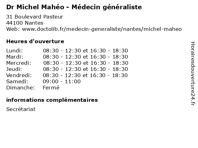 | Mardi | 08:30-12:30 et 16:30-18:30 |