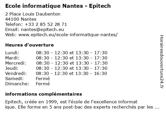 1 Epitech - Ecole informatique (Distance: 0,66 km) 5 rue d’Alger, 44100 Nantes ecole, epitech, formation, informatique, métiers 3 Viarme informatique (Distance: 1,53 km) 30 Place Viarme, 44000 Nantes affaires, dépannage, informatique, maintenance, service, vente, viarme 4 ICS - Conseil, services et maintenance informatique (Distance: 2,14 km) 46 quai Magellan, 44000 Nantes comptabilité, conseil, et, finance, gestion immobilière, ics, informatique, logiciel, maintenance, paie, recrutement, services 5 Epsi - Ecole d’ingénierie informatique (Distance: 2,74 km) 16 Boulevard Général de Gaulle, 44200 Nantes diplômes, d’ingénierie, ecole, epsi, formation, informatique, Études 6 AGM Informatique (Distance: 3,03 km) 10 Rue Gaëtan Rondeau, 44200 Nantes agm, badgeage, gestion des plannings, informatique, logiciel planification, logiciel planning, planning du personnel, planning médical |