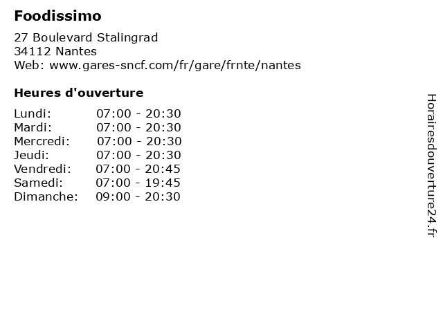 1 Foodissimo (Feries) (Distance: 0,00 km) 27 Boulevard Stalingrad, 34112 Nantes boutique, feries, foodissimo, presse, restaurant, services, tabac, transport 2 Gare de Nantes (Distance: 0,00 km) 27 Boulevard Stalingrad, 34112 Nantes boutique, de, gare, nantes, presse, restaurant, services, tabac, transport 3 Gare de Nantes (Feries) (Distance: 0,00 km) 27 Boulevard Stalingrad, 34112 Nantes boutique, de, feries, gare, nantes, presse, restaurant, services, tabac, transport 4 Relay (Nord) (Distance: 0,00 km) 27 Boulevard Stalingrad, 34112 Nantes boutique, nord, presse, relay, restaurant, services, tabac, transport 5 Relay (Nord-Feries) (Distance: 0,00 km) 27 Boulevard Stalingrad, 34112 Nantes boutique, feries, nord, presse, relay, restaurant, services, tabac, transport 6 Relay (Sud) (Distance: 0,00 km) 27 Boulevard Stalingrad, 34112 Nantes boutique, presse, relay, restaurant, services, sud, tabac, transport |