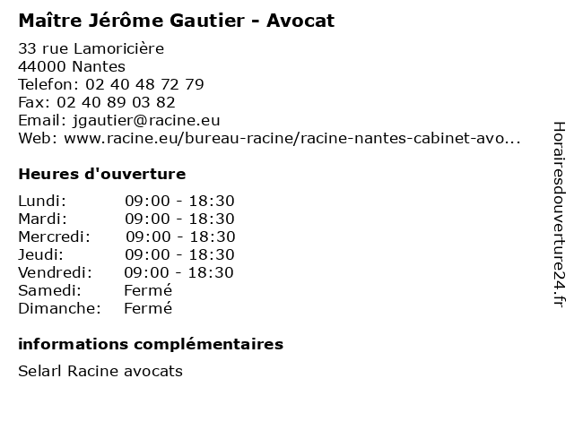 1 Maître Jérôme Wiehn - Avocat (Distance: 0,36 km) 28 boulevard de Launay, 44100 Nantes avocat, avocats, civils, droits, juridiques, jérôme, maître, wiehn 2 Office Notarial - Maître Jérôme Richard de Latour (Distance: 0,60 km) 14 boulevard Gabriel Guist'hau, 44000 Nantes achat, de, jérôme, latour, location, maître, notaire, notarial, office, richard, vente 3 Gautier-Debotté Chocolaterie (Distance: 1,01 km) 9 Rue de la Fosse, 44000 Nantes boulangeries, chocolaterie, confiserie, debotté, détail, gautier, georges 4 GAUTIER VANESSA (Distance: 1,47 km) 37 Rue Paul Painlevé, 44000 Nantes accompagnement personnel, bio quantique, développement personnel, gautier, magnétiseur, médecine douce, psychologie astrologie, shiatsu, vanessa, éducateur spécialisé 5 CHU Nantes - Urologie - Dr Jérôme Rigaud (Distance: 1,49 km) 1 Place Alexis-Ricordeau, 44093 Nantes bureau, chu, consultation, dr, jérôme, maladie, med, médecin, médecine, nantes, pratique, rigaud, thérapie, traitement, urologie 6 Maele Le Goff-Gautier - Sage-femme (Distance: 1,69 km) 38 boulevard Jean-Monnet, 44000 Nantes consultation, docteur, dr, femme, gautier, goff, le, maele, med, médecin, sage, traitement |