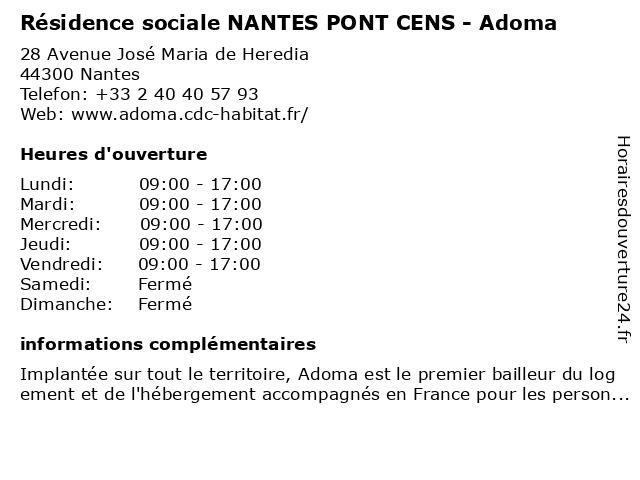 1 CDC Habitat - Adoma (Distance: 0,05 km) 28 avenue Jose Maria De Heredia, 44300 Nantes accompagnement, adoma, cdc, habitat, hébergement, logement sociaux, résidence, résidence hôtelière 2 Marché du Pont du Cens à Nantes (Distance: 0,25 km) . Rue Chanoine Poupard, 44000 Nantes cens, du, frutas, hortalizas, marché, mercado, nantes, pont, verduras 3 Beauté du cens (Distance: 0,26 km) 97 route de Rennes, 44700 Orvault beauté, cens, du, institut, ongles, soins, épilation 4 Tabac Presse Les Collines du Cens (Distance: 0,66 km) 162 boulevard Robert Schuman, 44300 Nantes bar, cens, cigarette, collines, du, journaux, les, presse, tabac 5 Résidence sociale NANTES R SCHUMAN - Adoma (Distance: 0,77 km) 138 Boulevard Robert Schuman, 44300 Nantes adoma, nantes, résidence, schuman, sociale 6 Résidence Universitaire Alice Milliat (Distance: 1,53 km) 13-21 Rue du Fresche Blanc, 44300 Nantes alice, milliat, résidence, universitaire |