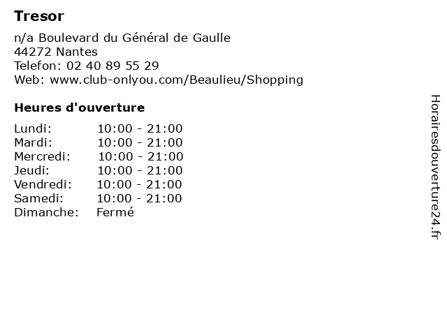 1 Tresor (Distance: 9,68 km) . Rue James Cook, 44800 Saint-Herblain beaute, bijoux, chaussures, etam, lingerie, maison, mode enfant, mode femme, mode homme, restaurant, sport, tresor 2 Camaieu (Distance: 0,00 km) n/a Boulevard du Général de Gaulle, 44272 Nantes accessoires, bijoux, camaieu, femme, mode, montres 3 Claire's (Distance: 0,00 km) n/a Boulevard du Général de Gaulle, 44272 Nantes accessoires, bijoux, claire's, femme, mode, montres 4 Phildar (Distance: 0,00 km) n/a Boulevard du Général de Gaulle, 44272 Nantes accessoires, bijoux, femme, mode, montres, phildar 5 Marc Orian (Distance: 2,77 km) . Boulevard du Général de Gaulle, 44000 Nantes bijouterie, bijoux, diamant, marc, montres, orian, réparations 6 Le Manège à Bijoux (Distance: 6,03 km) 10 Rond Point de la Corbinerie, 44412 Reze bijoux, le, manège, montres. |