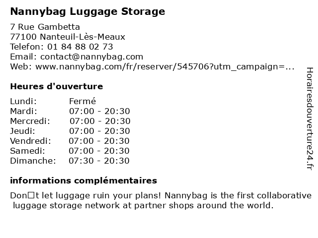 1 Nannybag Luggage Storage (Distance: 0,81 km) 4 All. De L'ancienne Ferme, 77100 Nanteuil-Lès-Meaux luggage, nannybag, storage 2 Nannybag Luggage Storage (Distance: 3,40 km) 29 Rue Du Commandant Berge, 77100 Meaux luggage, nannybag, storage 3 Nannybag Luggage Storage (Distance: 4,29 km) 32 Rue Alexandre Volta, 77100 Meaux luggage, nannybag, storage 4 Nannybag Luggage Storage (Distance: 4,34 km) Rue Clemenceau Commercial E.leclerc, 57360 Amneville luggage, nannybag, storage 5 Nannybag Luggage Storage (Distance: 6,88 km) 3 Avenue De La Mairie, 77450 Montry luggage, nannybag, storage 6 Nannybag Luggage Storage (Distance: 7,87 km) 2 Rue Du Général Leclerc, 77580 Crécy-La-Chapelle luggage, nannybag, storage |