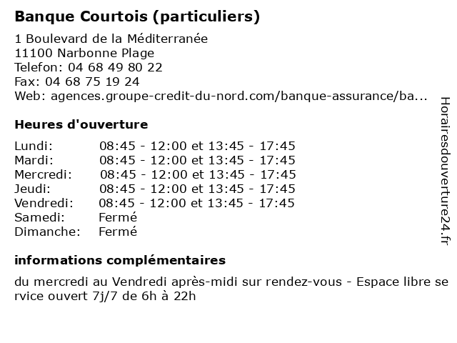 1 Banque Courtois (commerçants) (Distance: 0,00 km) 1 Boulevard de la Méditerranée, 11100 Narbonne Plage agence, bancaire, banque, commerçants, courtois 2 Carrefour Banque (Distance: 11,65 km) - Avenue Hubert Mouly, 11785 Narbonne assurances, banque, carrefour, services 3 Banque Populaire du Sud (Distance: 11,65 km) 25 avenue Maître Hubert Mouly, 11100 Narbonne banque, du, narbonne, populaire, sud 4 Banque Populaire du Sud (Distance: 13,15 km) 35 cours de la République, 11100 Narbonne banque, du, narbonne, populaire, sud 5 Banque Populaire du Sud (Distance: 13,17 km) 17 place Thérèse Léon Blum, 11100 Narbonne banque, du, narbonne, populaire, sud 6 Banque Courtois (Distance: 13,24 km) 19 cours de la République, 11100 Narbonne agence, bancaire, banque, courtois |