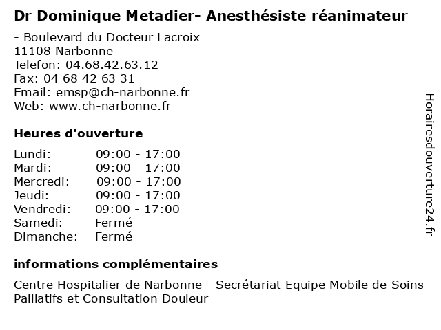 1 Dr Benoit Bataille - Anesthésiste (Distance: 0,00 km) - Boulevard Docteur Lacroix, 11100 Narbonne anesthésiste, bataille, benoit, consultation, docteur, dr, med, médecin, traitement 2 Dr Randa El Hachem - Anesthésiste (Distance: 0,00 km) - Boulevard Docteur Lacroix, 11100 Narbonne anesthésiste, consultation, docteur, dr, el, hachem, med, médecin, randa, traitement 3 Dr Mihaela-Oana Gaman - Anesthésiste (Distance: 0,00 km) - Boulevard Docteur Lacroix, 11100 Narbonne anesthésiste, consultation, docteur, dr, gaman, med, mihaela, médecin, oana, traitement 4 Dr Daniel Hochart - Anesthésiste (Distance: 0,00 km) - Boulevard Docteur Lacroix, 11100 Narbonne anesthésiste, consultation, daniel, docteur, dr, hochart, med, médecin, traitement 5 Dr Caroline Metais - Anesthésiste (Distance: 0,00 km) - Boulevard Docteur Lacroix, 11100 Narbonne anesthésiste, caroline, consultation, docteur, dr, med, metais, médecin, traitement 6 Dr Michel Mora - Anesthésiste (Distance: 0,00 km) - Boulevard Docteur Lacroix, 11100 Narbonne anesthésiste, consultation, docteur, dr, med, michel, mora, médecin, traitement |